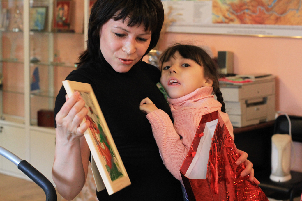 Сегодня многофункциональную реабилитационную коляску Kimba Spring вручили маме девочки Ирине Ильиных. Ответный подарок – выполненная Верочкой вместе с мамой пластилиновая картинка. Сергей Бондаренко обещал передать слова благодарности и поделку лично Владимиру Богданову.