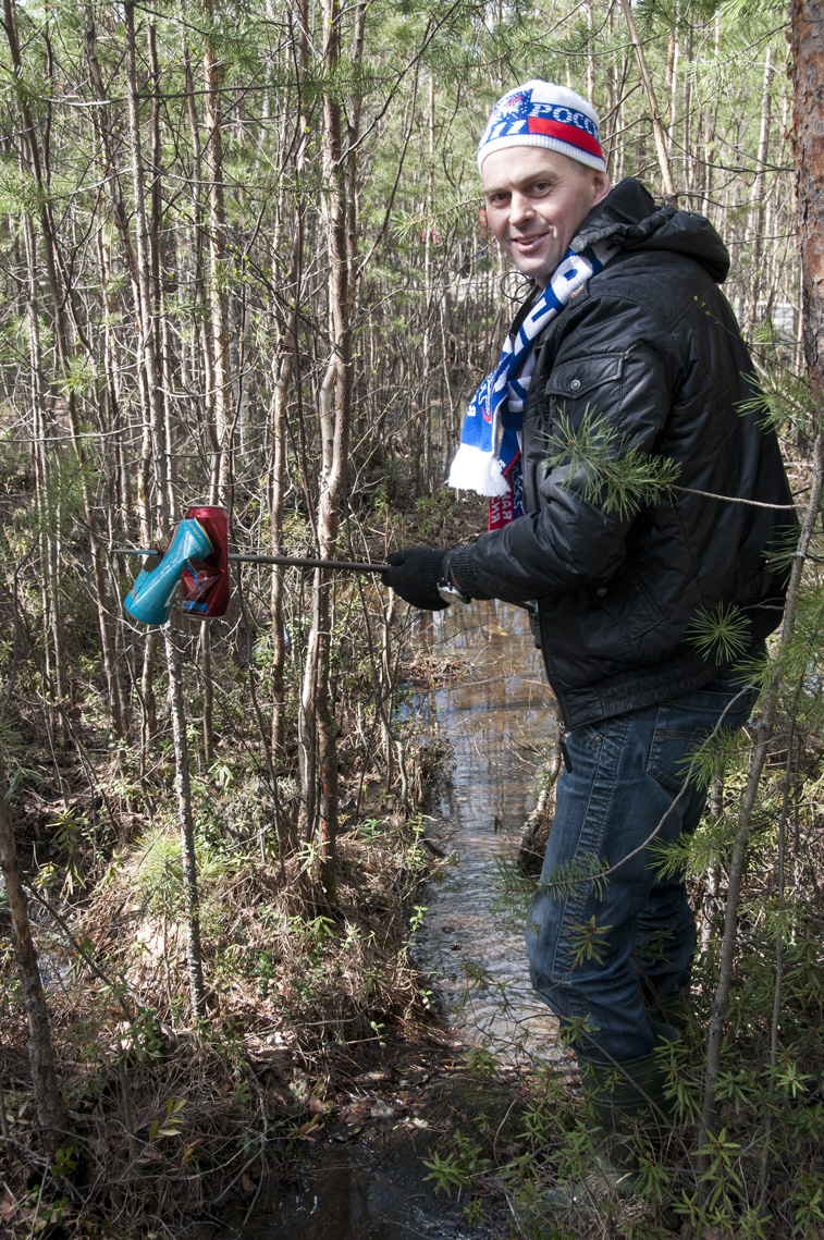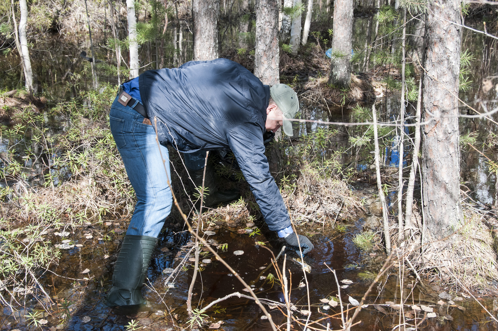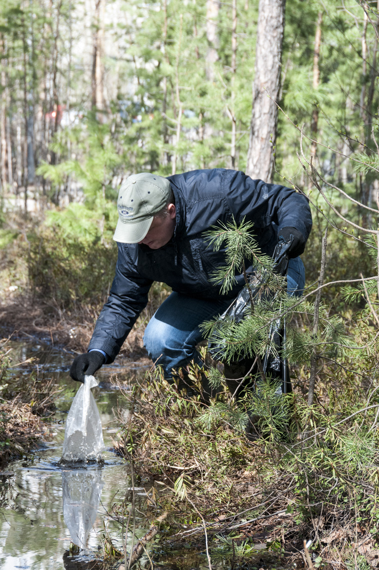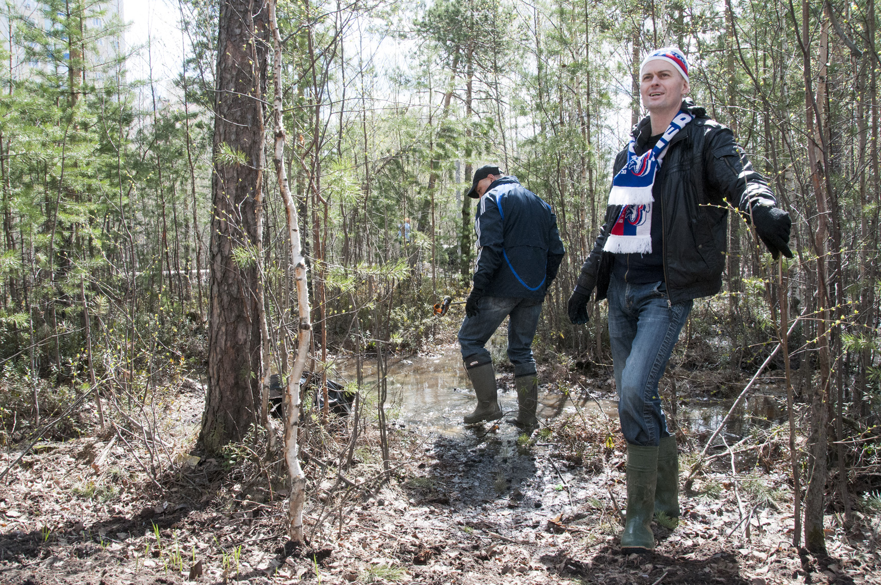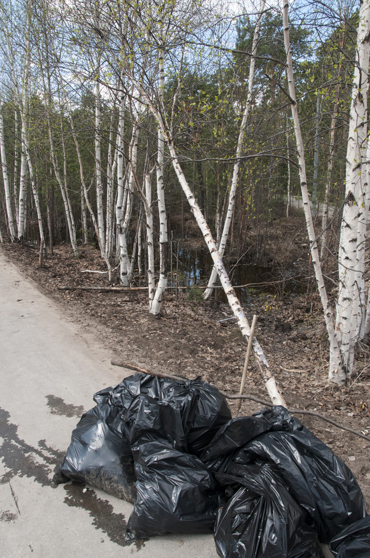 Отличить участников субботника в 32 микрорайоне можно было по резиновым сапогам. Большая часть парка ещё стоит в воде. Прямо из неё и извлекали пакеты, банки, бутылки, пластиковые стаканчики.
