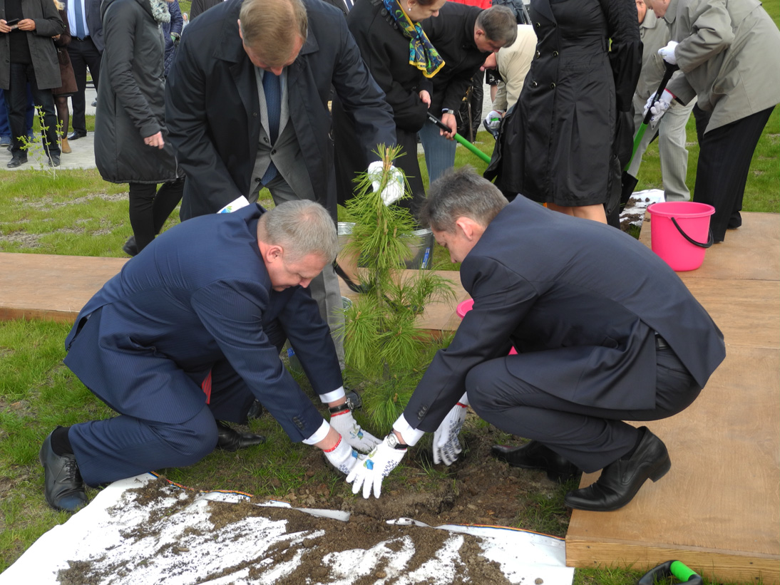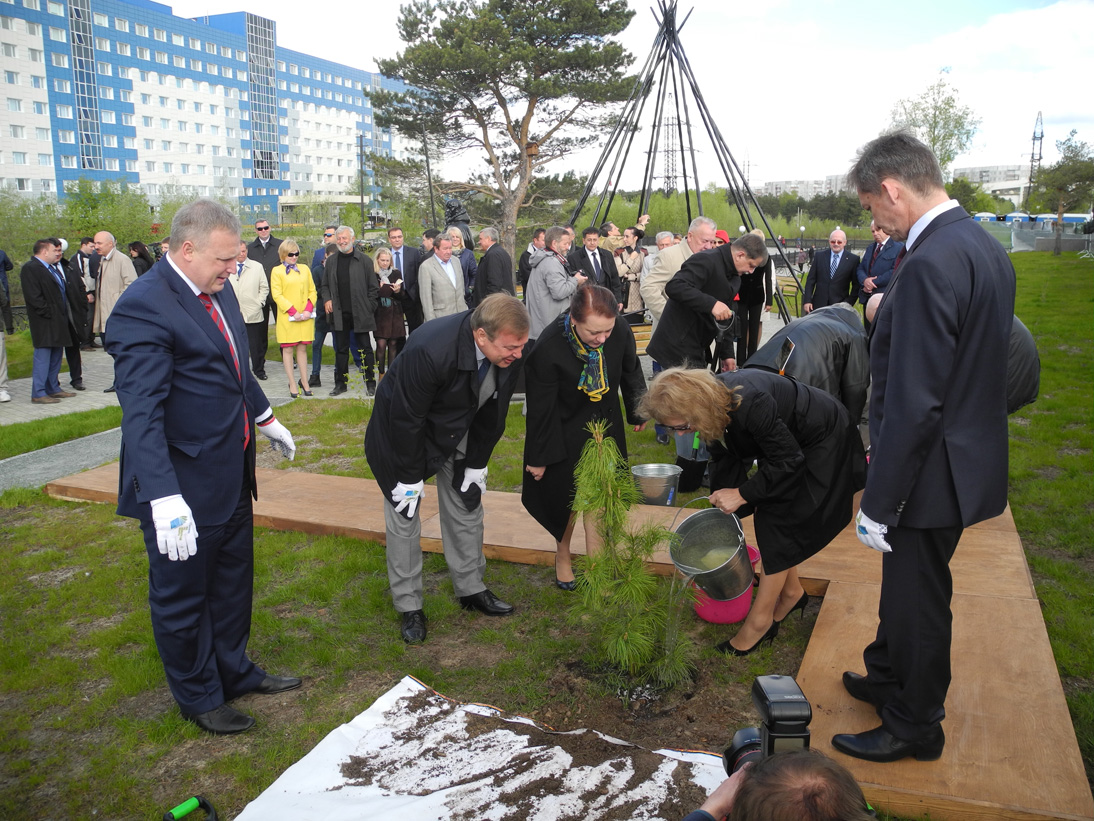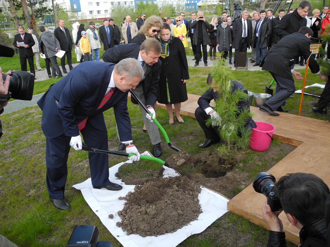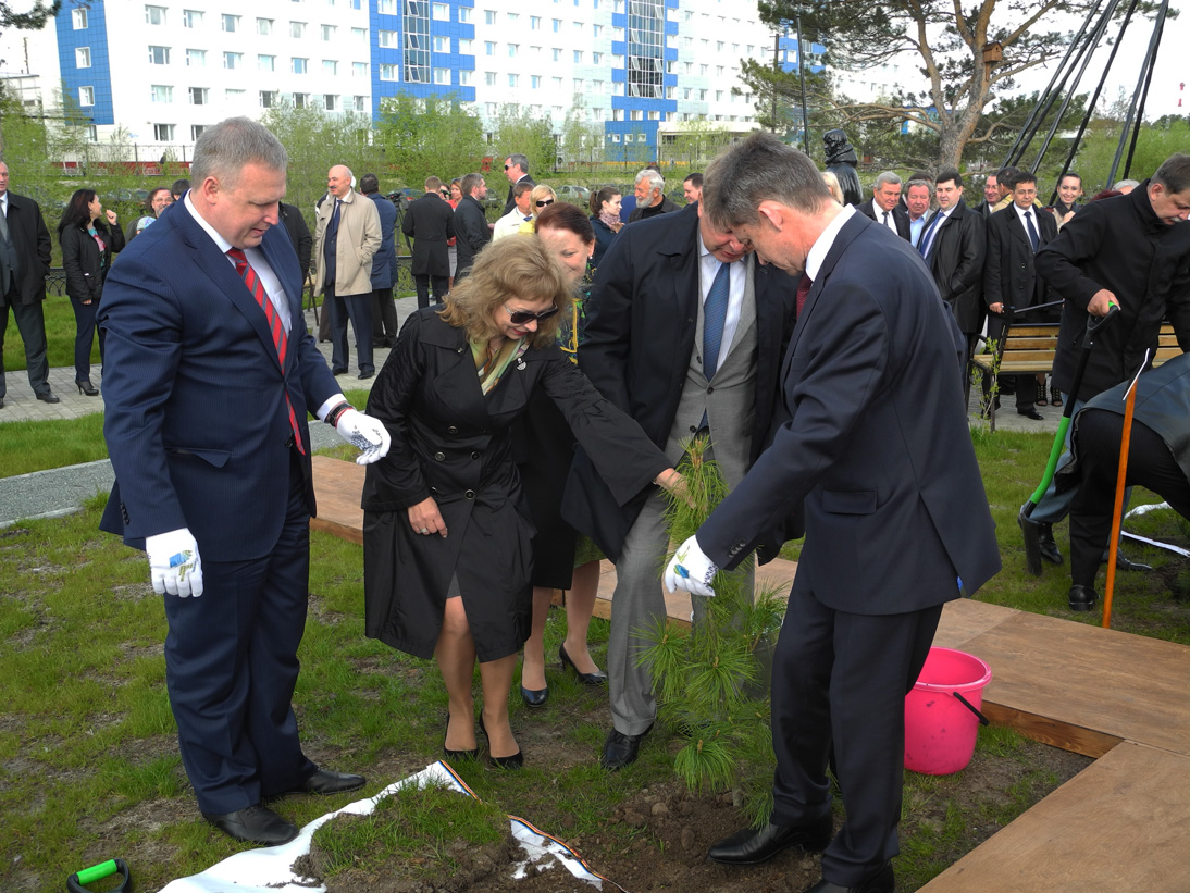 Председатель Думы Сергей Бондаренко вместе с Главой города Дмитрием Поповым и генеральным директором ООО «Газпром трансгаз Сургут» Игорем Ивановым посадил на аллее сибирский кедр.