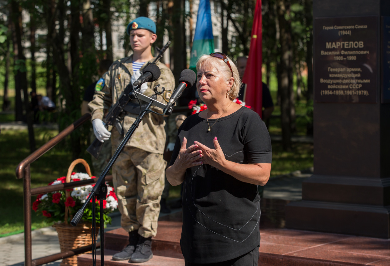 Надежда Александровна, обращаясь к Лидии Константиновне, сказала: «Я знаю, что такое терять родного человека, для которого нет ничего священней воинского долга. Мне очень близка Ваша боль… Но такие люди, как Александр Маргелов, не могут по другому. Защищать Родину – это не просто их обязанность, это дело их чести. Это их призвание, их долг, их судьба! Поэтому отец и сын Маргеловы – пример героизма для всех жителей нашей страны. Открытие памятника Александру Маргелову в Сургуте – это дань памяти, это знак низкого поклона перед его подвигом. Александр Васильевич продолжил дело своего отца. Он служил ради жизни и во имя процветания Родины. Это и есть высшее проявление патриотизма».