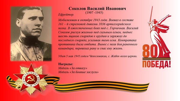 В боевых действиях по освобождению территории Чехословакии с октября 1944 года по май 1945 года разные степени ранений получили 411514 советских солдат, погибли – 139918. В их числе и Василий Иванович Соколов, дедушка депутата Владимира Клишина. Он погиб 5 мая 1945 года, как написано в похоронке – в селе Жабен, возле церкви. Захоронен в Чехословакии.