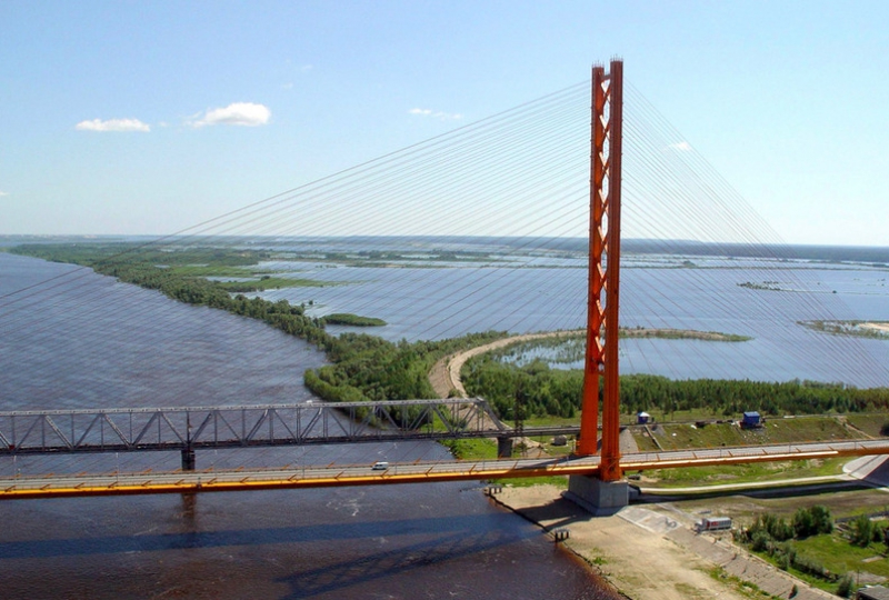 Он попал в книгу рекордов Гиннеса за самый длинный – четырехсотметровый вантовый пролёт. Мост поддерживает только один пилон. Это уникальное сооружение, потому что руководил строительством уникальный человек – Валентин Солохин. По признанию Валентина Федоровича, он вынашивал идею такой конструкции несколько десятилетий. Мысль о строительстве автомобильного моста зародилась в передовом сознании Солохина в 1975 году, после запуска железнодорожного. И вот, через двадцать лет, в 1995 году на расстоянии 67 метров от железнодорожного началось строительство сооружения, которое в последствии будет признано выдающимся не только в отечественном, но и в мировом мостостроении.